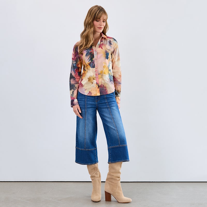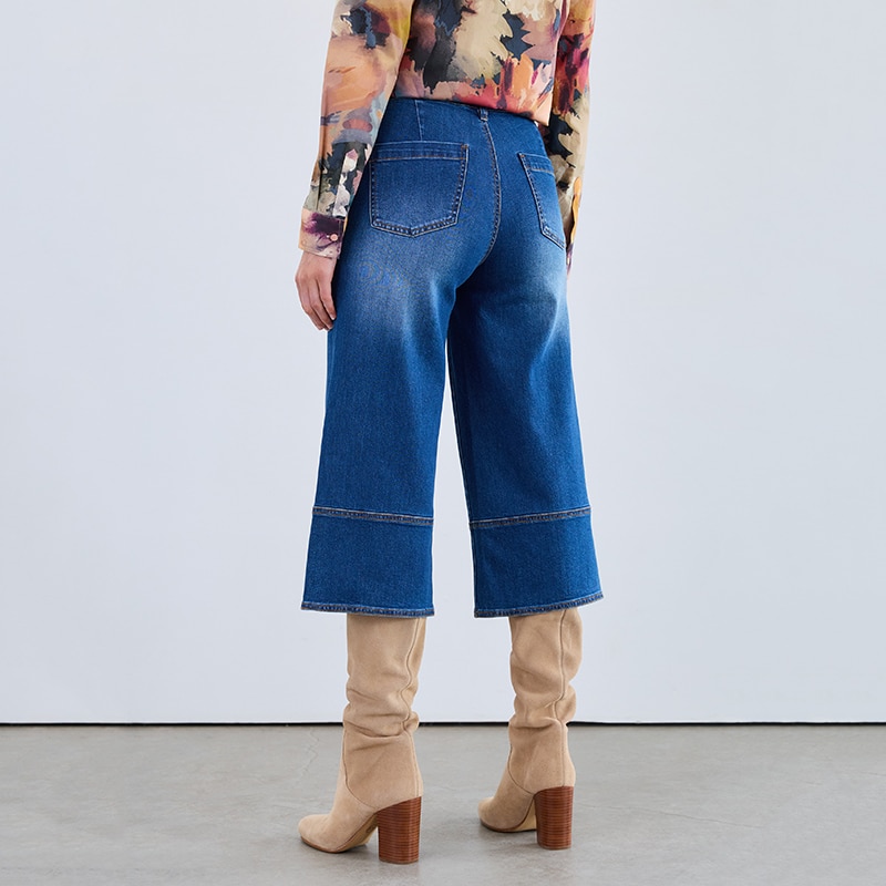 Gaucho en denim foncé légèrement délavé aux cuisses, taille Olivia(régulière) bouton et fermoir, poches en biais.