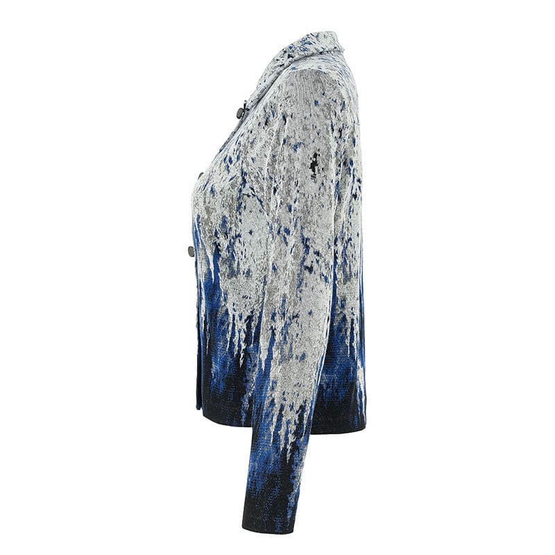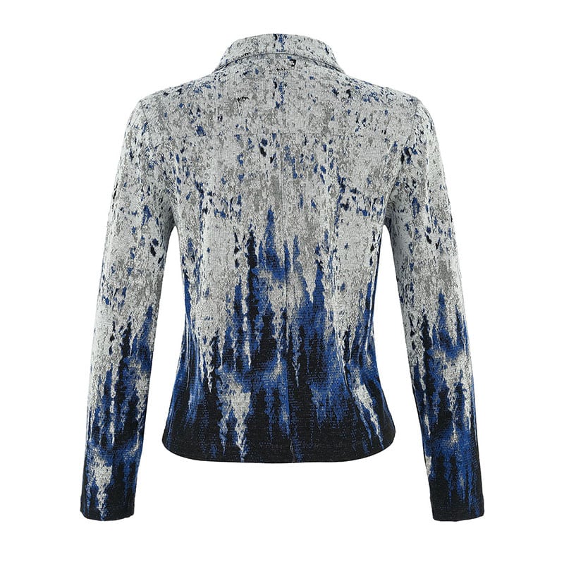 Modèle droit, gros boutons noirs, bleu imprimé dégradé.