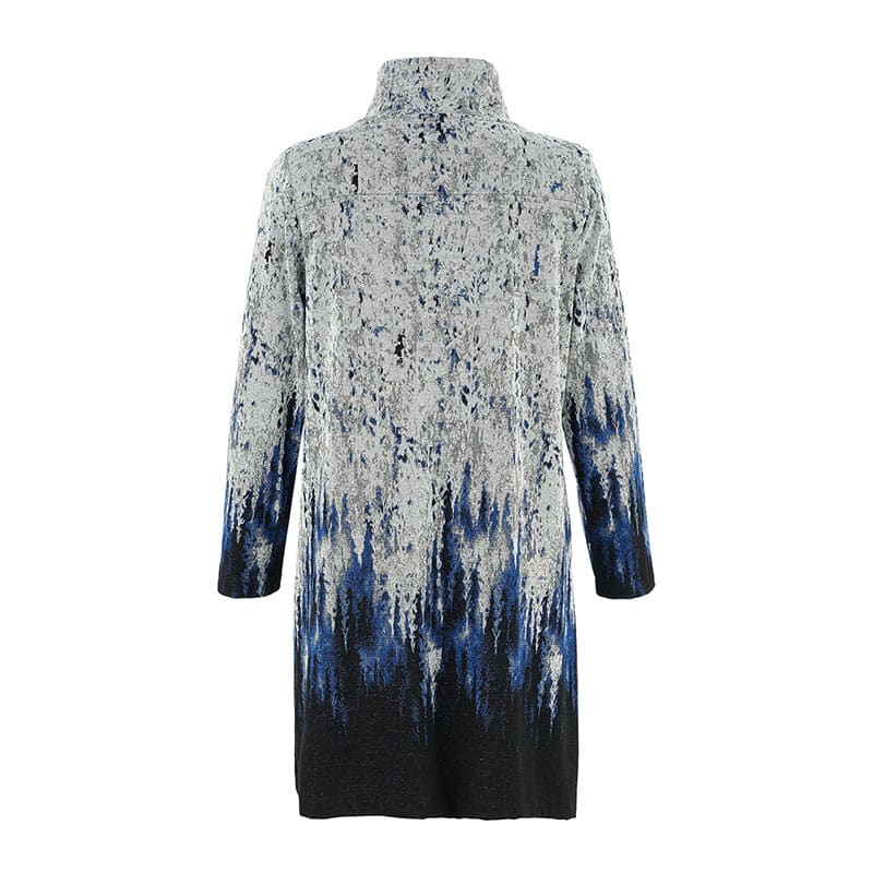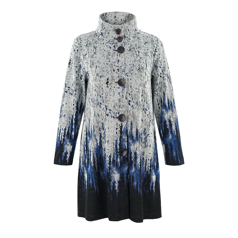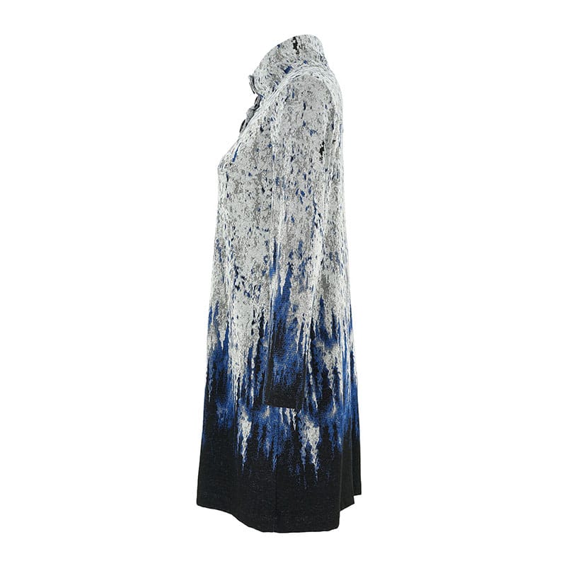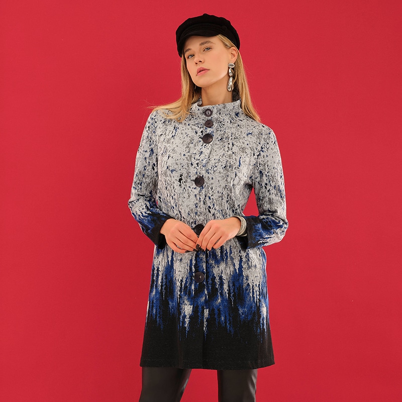 Modèle redingote qui pourrait se porter en robe avec un collant, gros boutons noir, poches dans les coutures de côté.