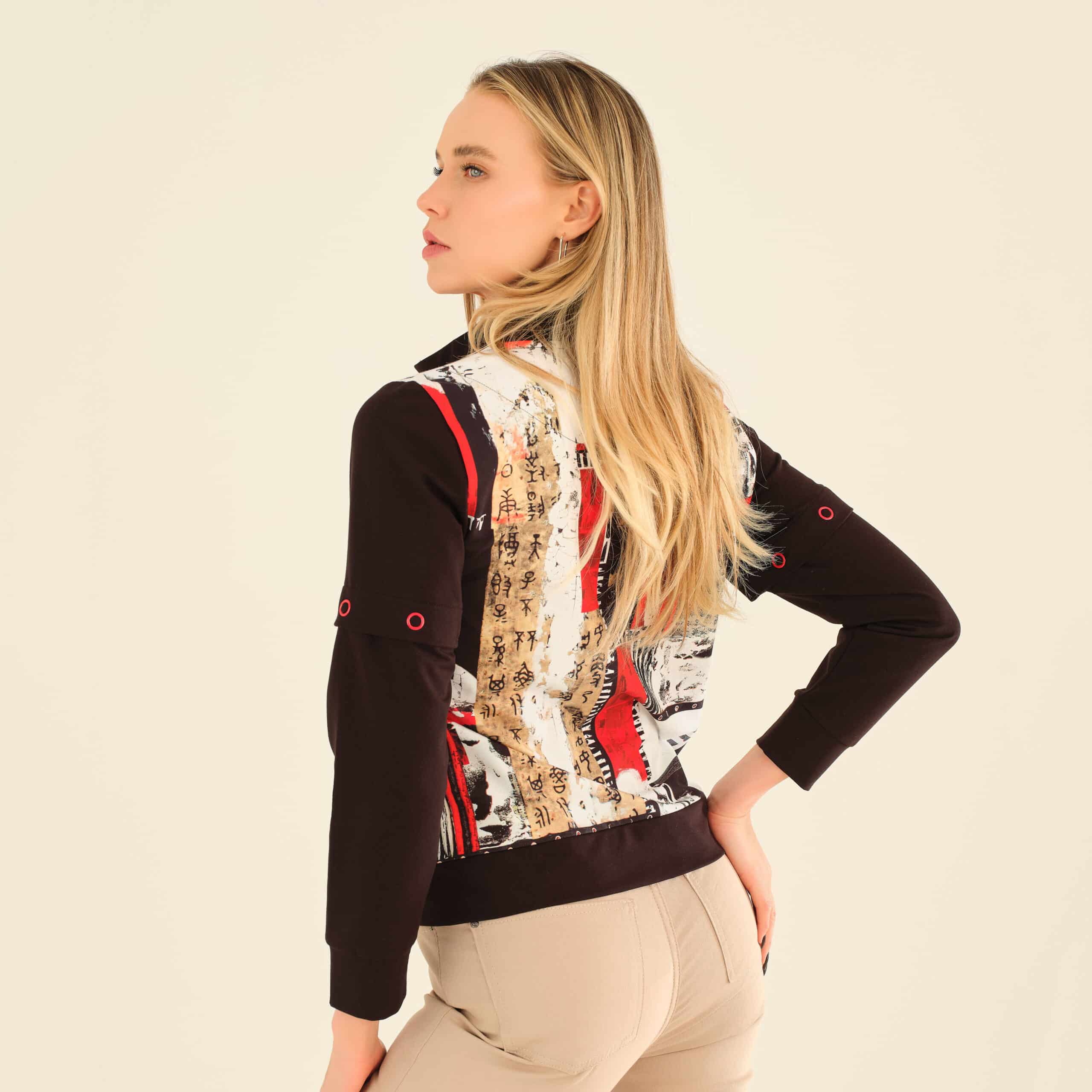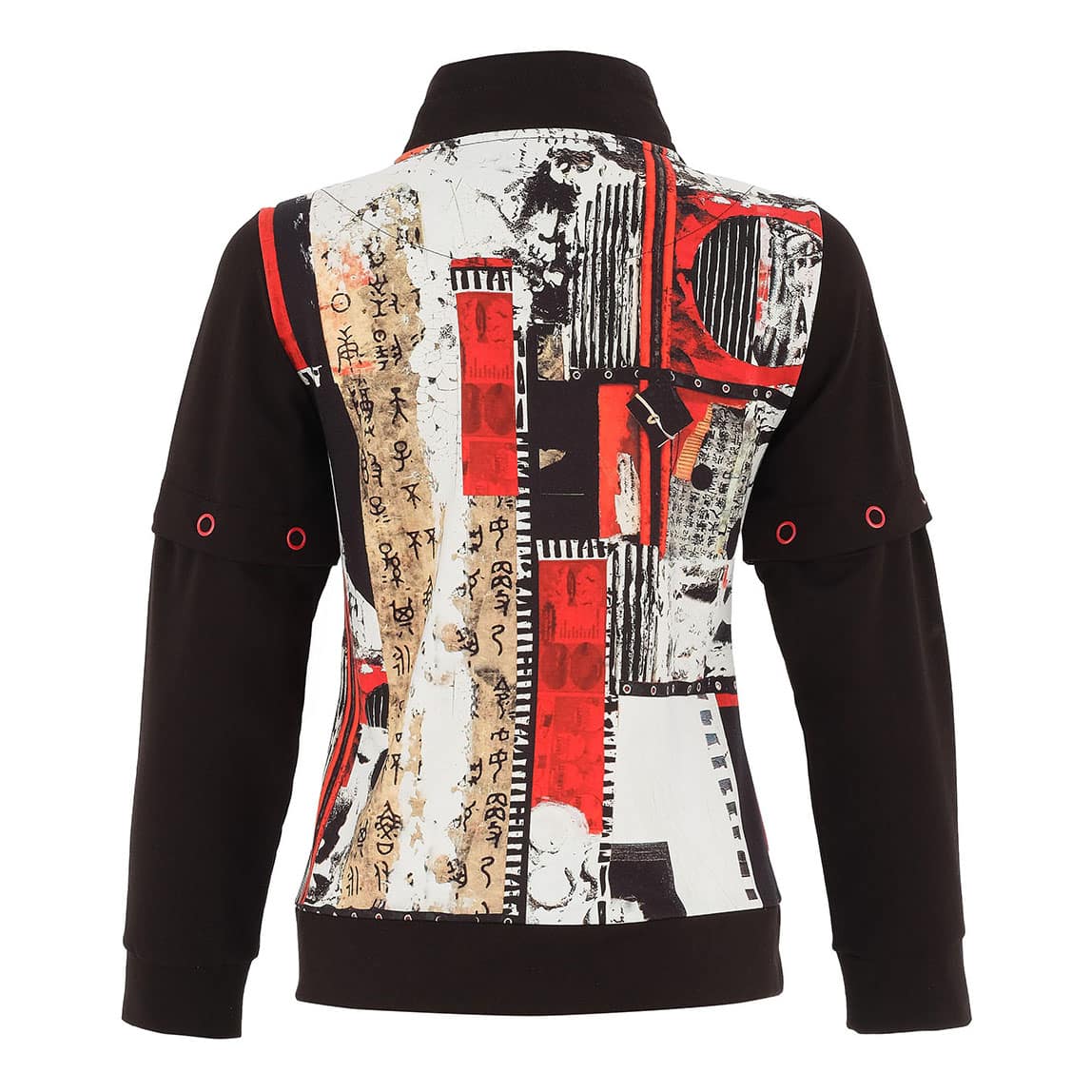 Jacket en jersey de coton à manches longues détachables sur des boutons pressions rouges, col montant.
