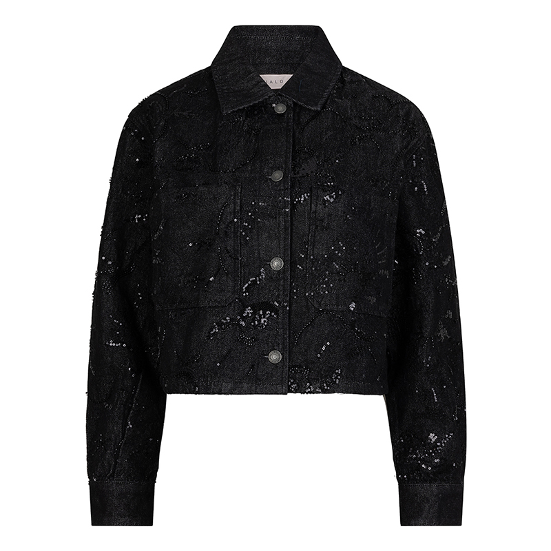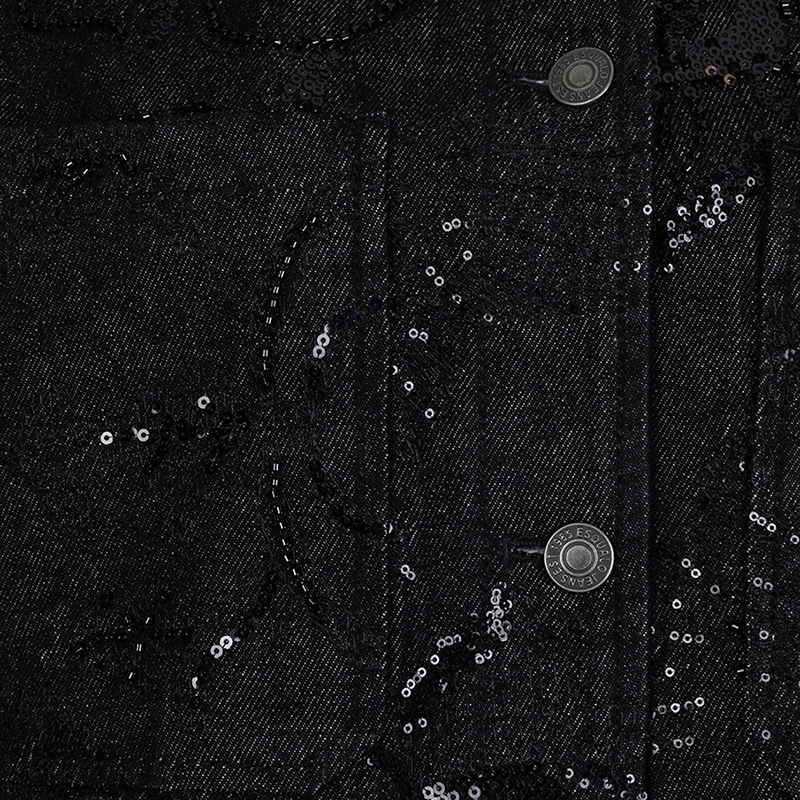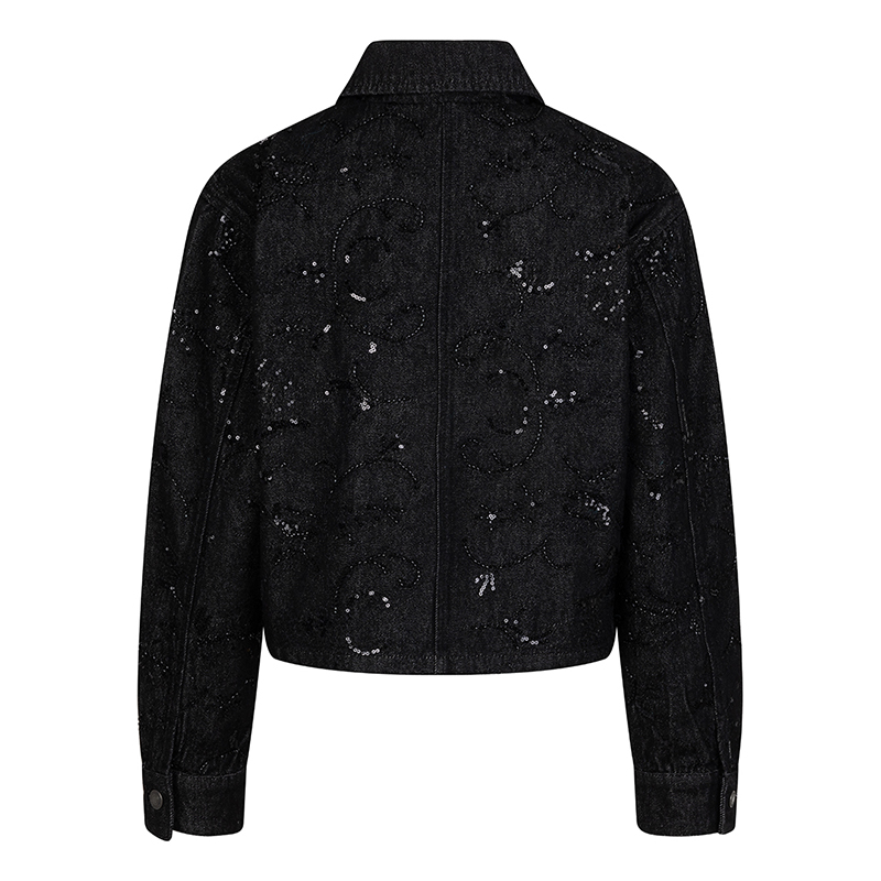 Modèle court et ample, deux poches plaquées, disponible noir avec broderies et paillettes ton sur ton.