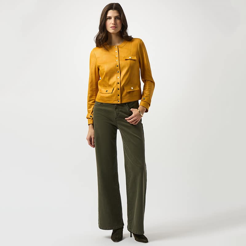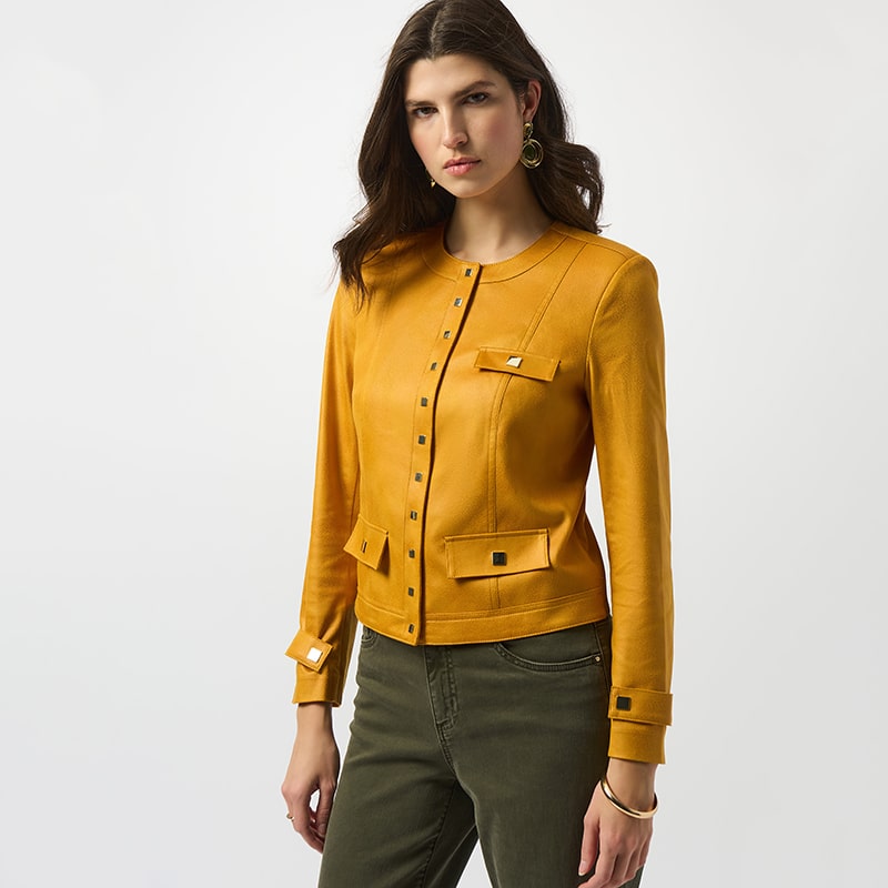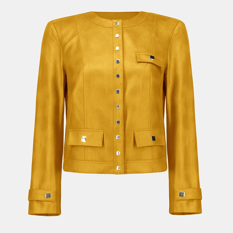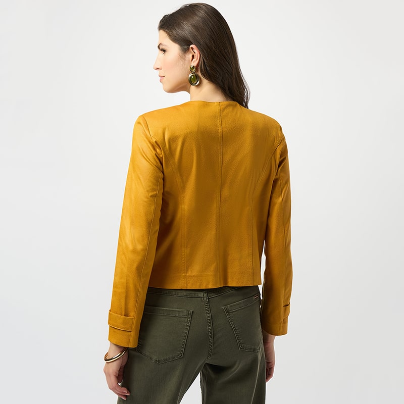 Jacket en faux suède jaune à manches longues avec une martingale aux poignets, sans col.