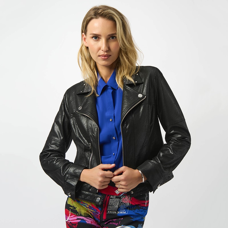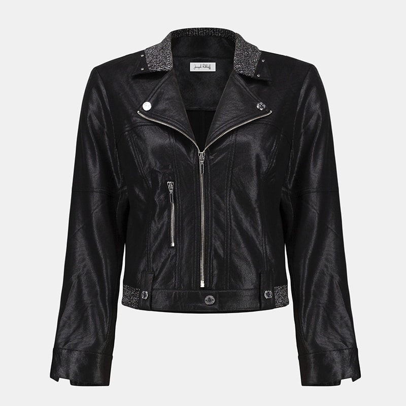 Jacket court en similicuir à manches longues, col ouvert avec fermeture éclair argent.