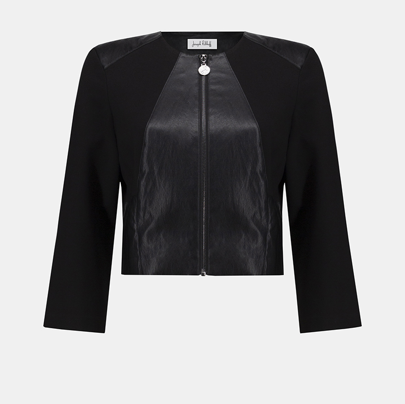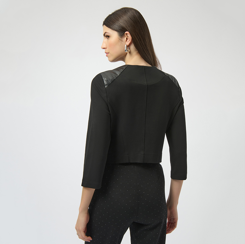 Modèle court et ajusté, mélange de tricot et de similicuir, fermeture éclair.