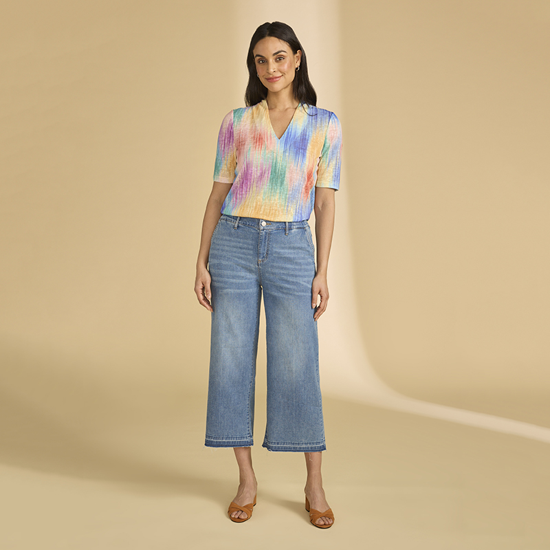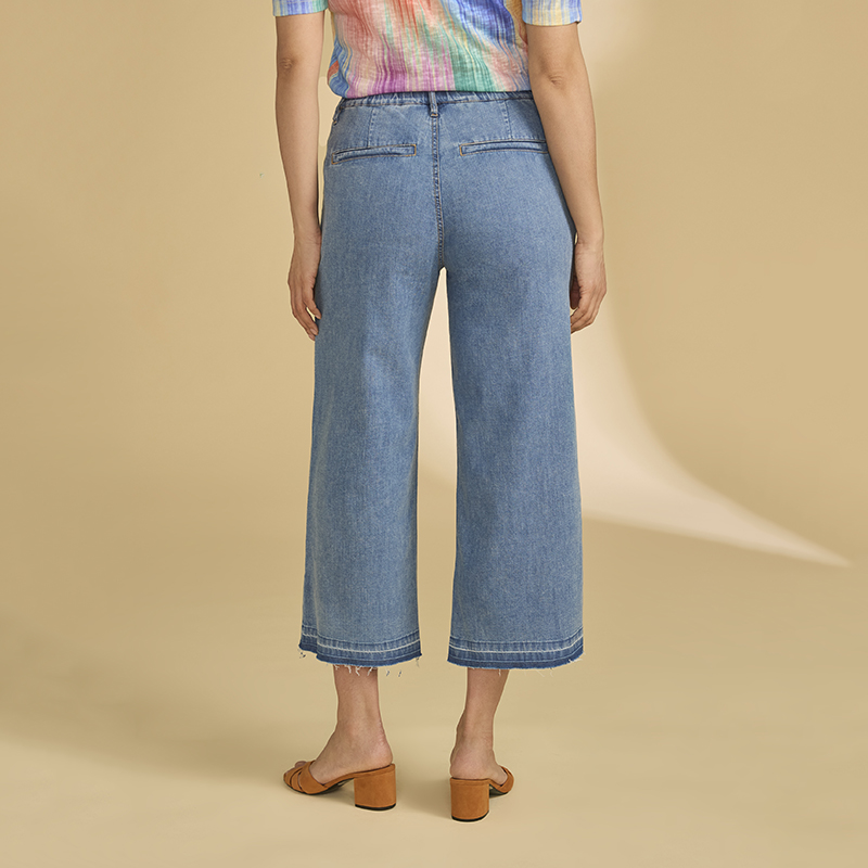 Jeans longueur 7/8, taille élastique au dos, fermoir et bouton.