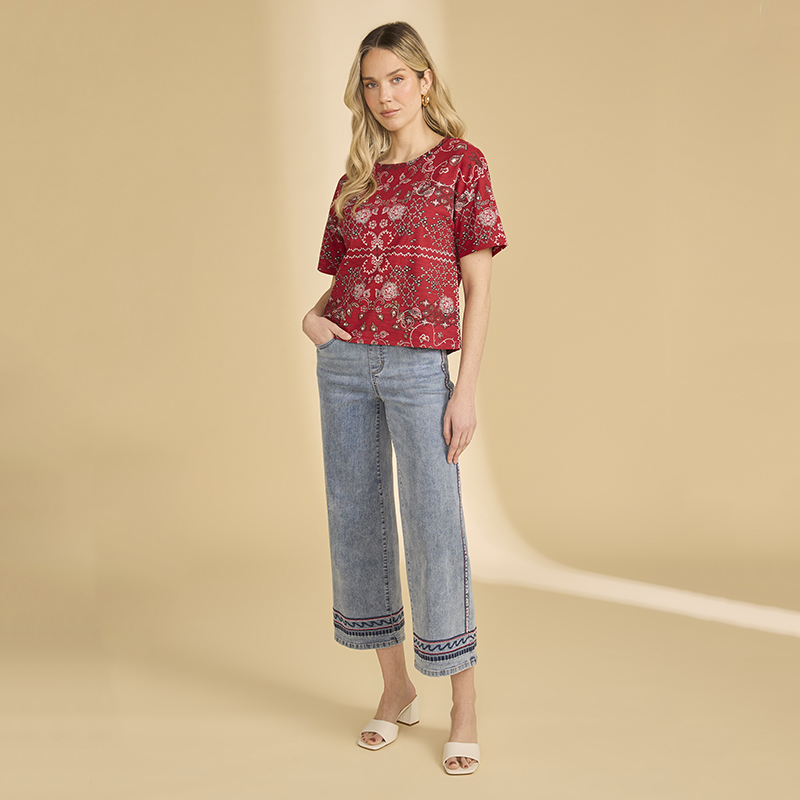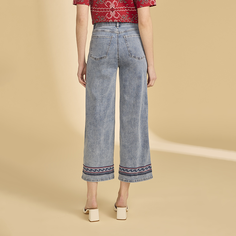 Modèle jambes larges en denim moyen, broderie au bas et sur le côté extérieur des jambes marine et rouge.
