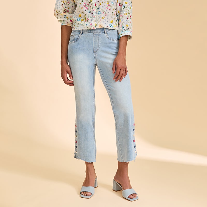 Jeans bande de taille élastique confortable, longueur 7/8, jambes droites.