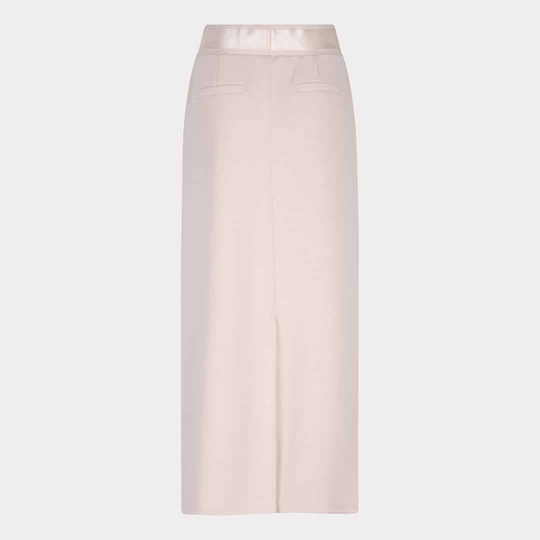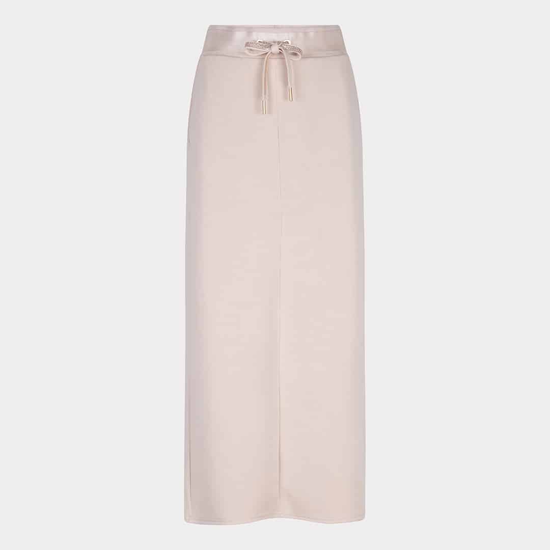 Jupe longue, taille élastique et cordon décoratif, ouverture à l’arrière.