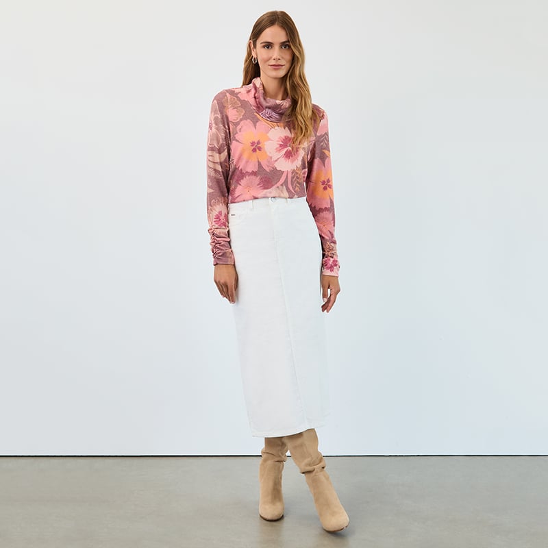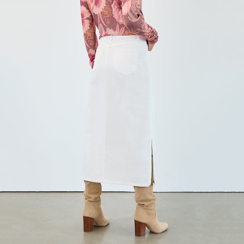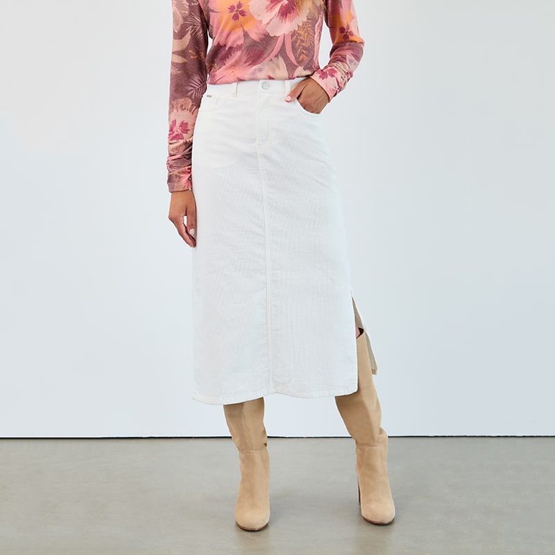 Jupe longue en velour cordé, taille régulière avec fermoir et bouton.