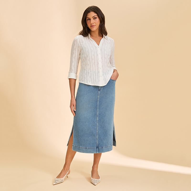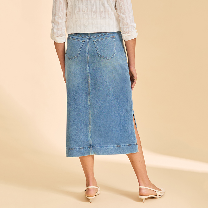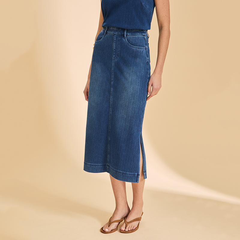 Jupe longue et droite ouverture de chaque côté, bande de taille élastique.