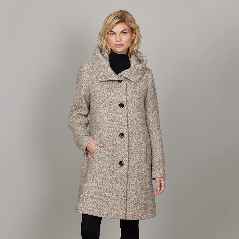 Manteau en lainage bouclé au genou, collet haut avec un grand capuchon non détachable, poches en biais.