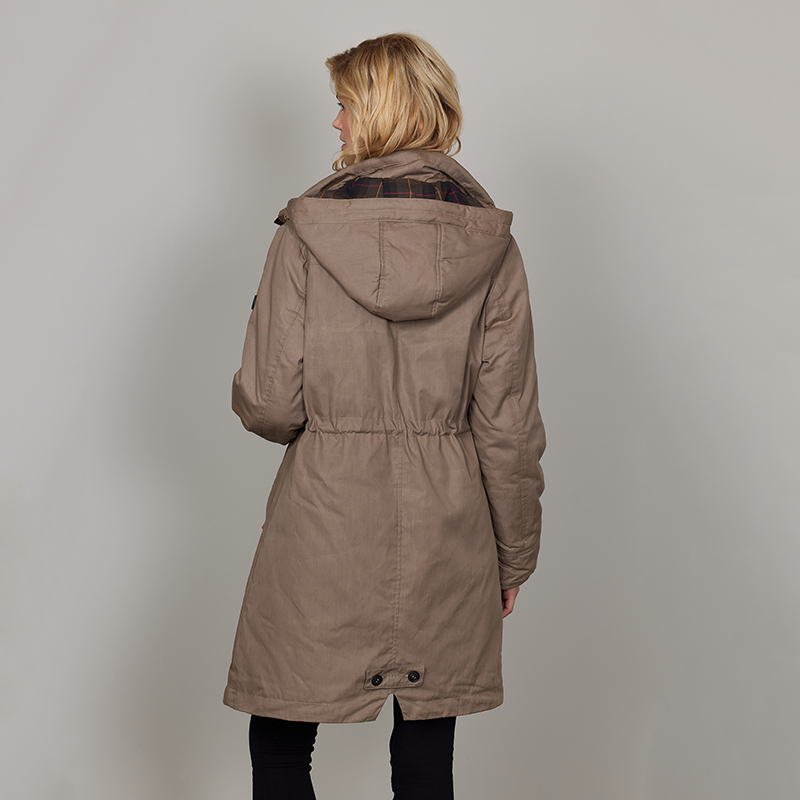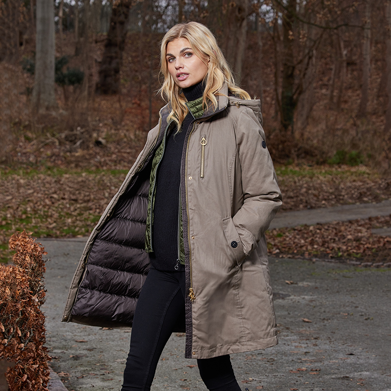 Manteau en coton 7/8 au genou, fermeture éclair cachée, capuchon détachable.