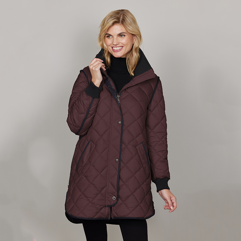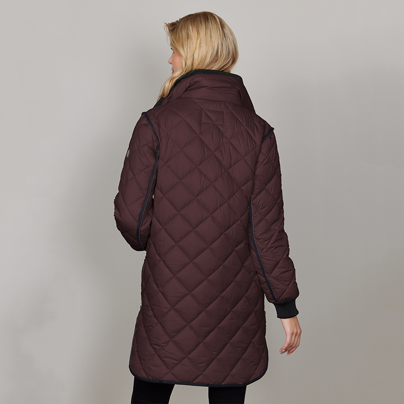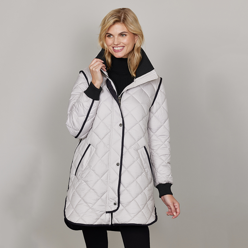 Manteau matelassé polyvalent sport-chic, longueur 3/4 environ mi-cuisse, col montant sans capuchon.
