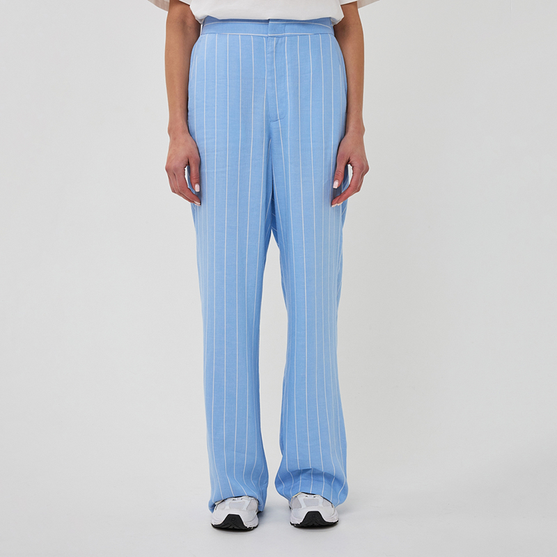 Modèle jambes droites, poches en biais, matière très souple disponible bleu rayure fine blanche