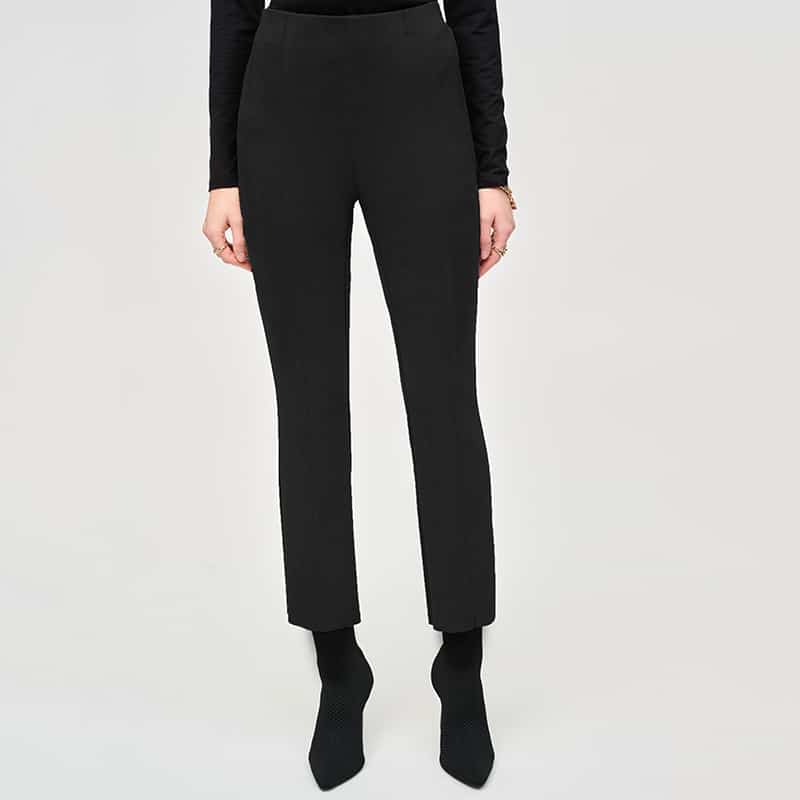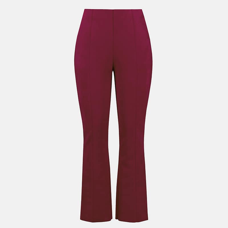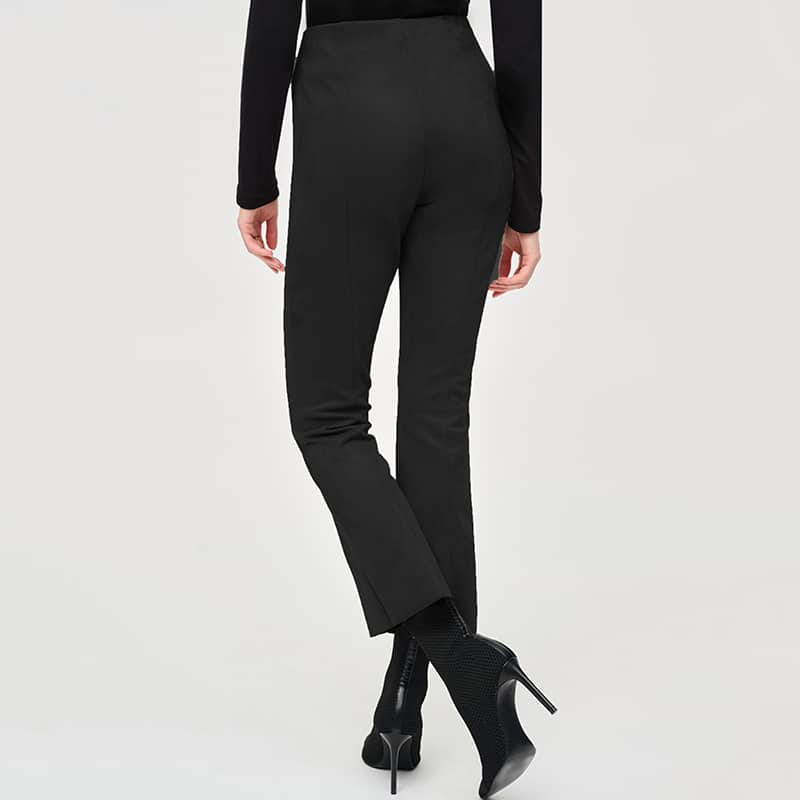 Modèle en suédine noir ou merlot, ajusté et légèrement évasé au bas, surpiqûre ton sur ton sur le devant et à l’arrière des jambes.