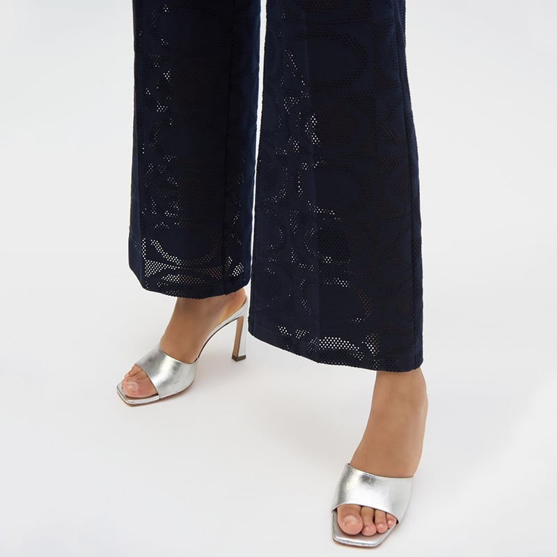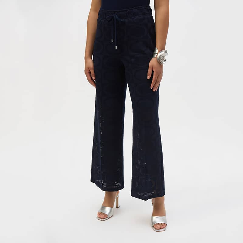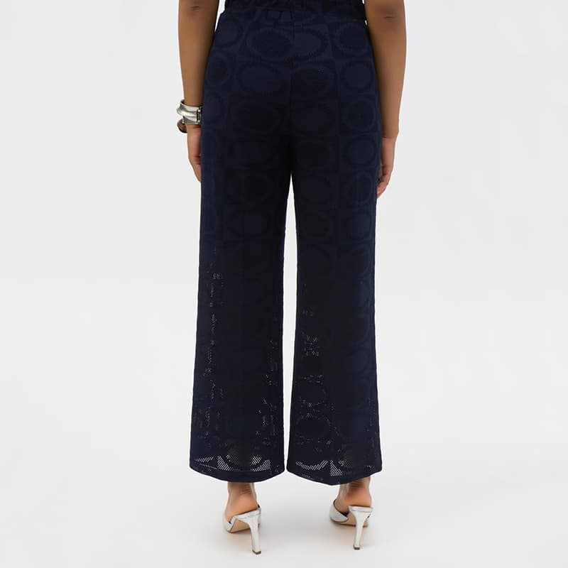 Beau pantalon en tricot ajouré de motifs dentelles, taille élastique avec cordon.