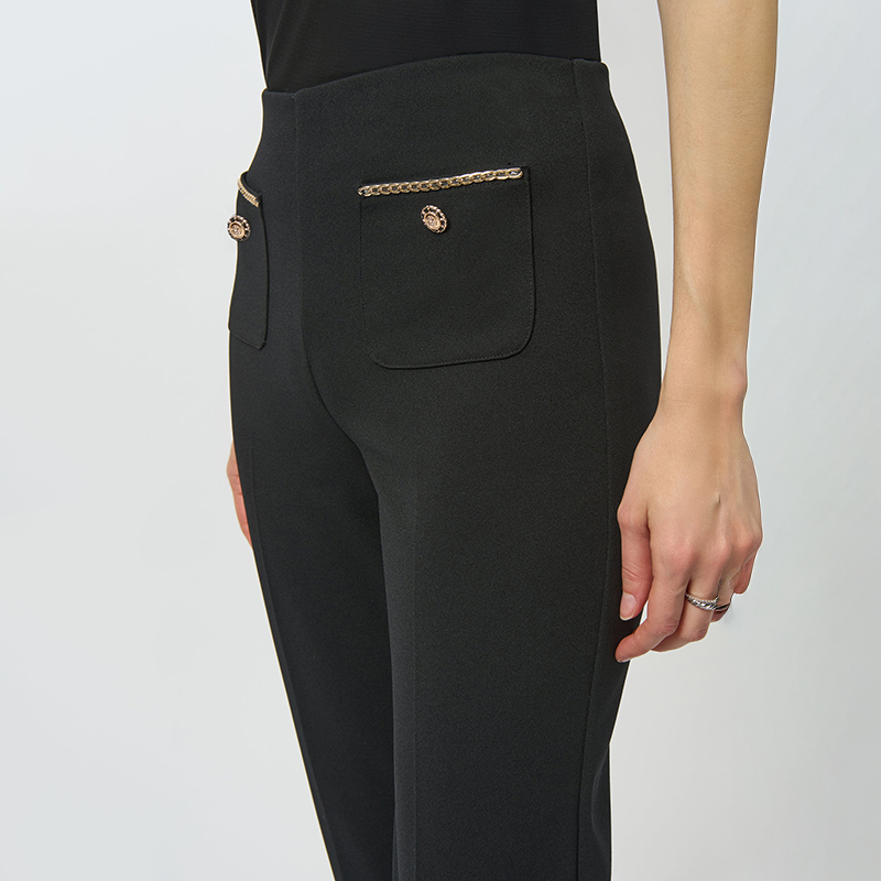 Modèle jambe droite, petites poches plaquées aux hanches avec détails de chaînettes dorées.