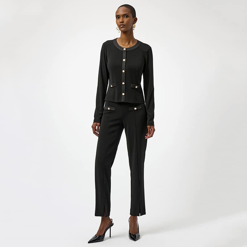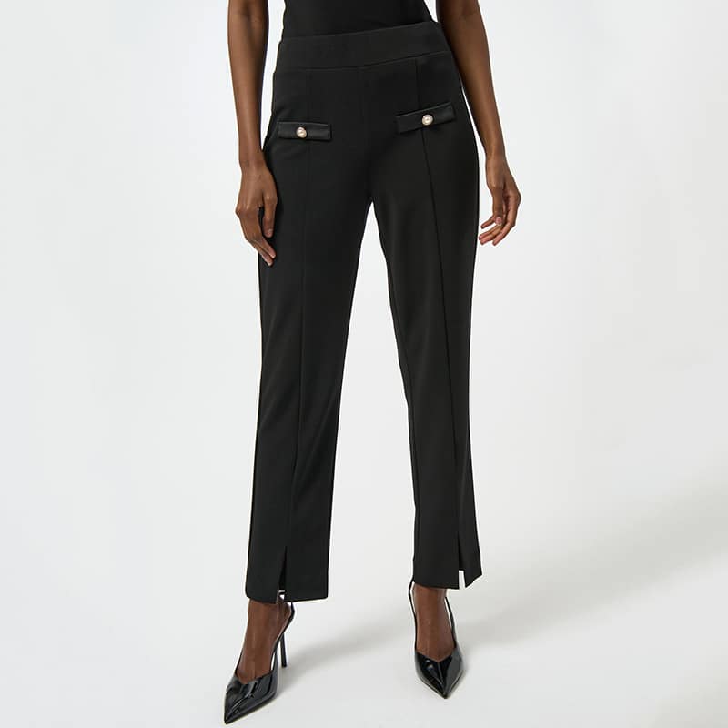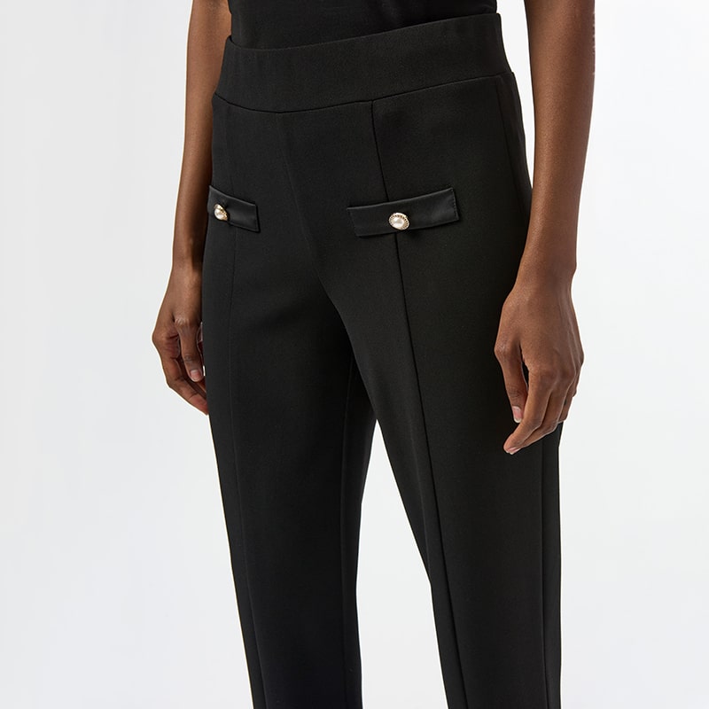 Deux petites fausses poches ornées d’un bouton perle, disponible noir.