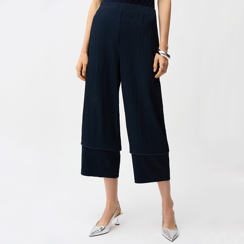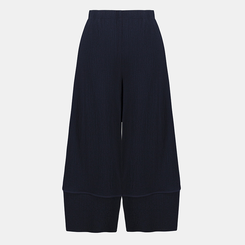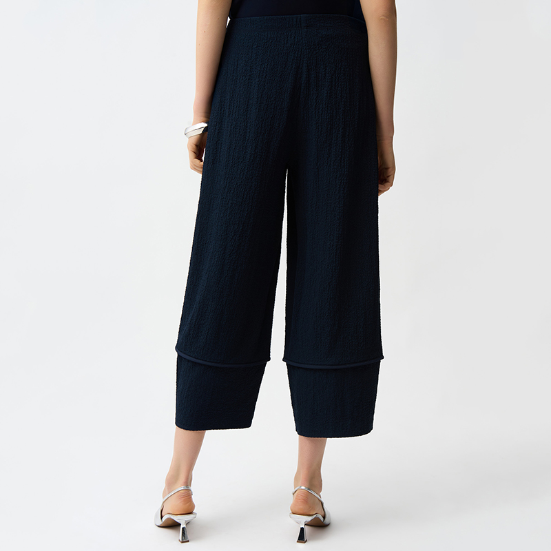 Pantalon taille élastique, sans poches, jambes larges.