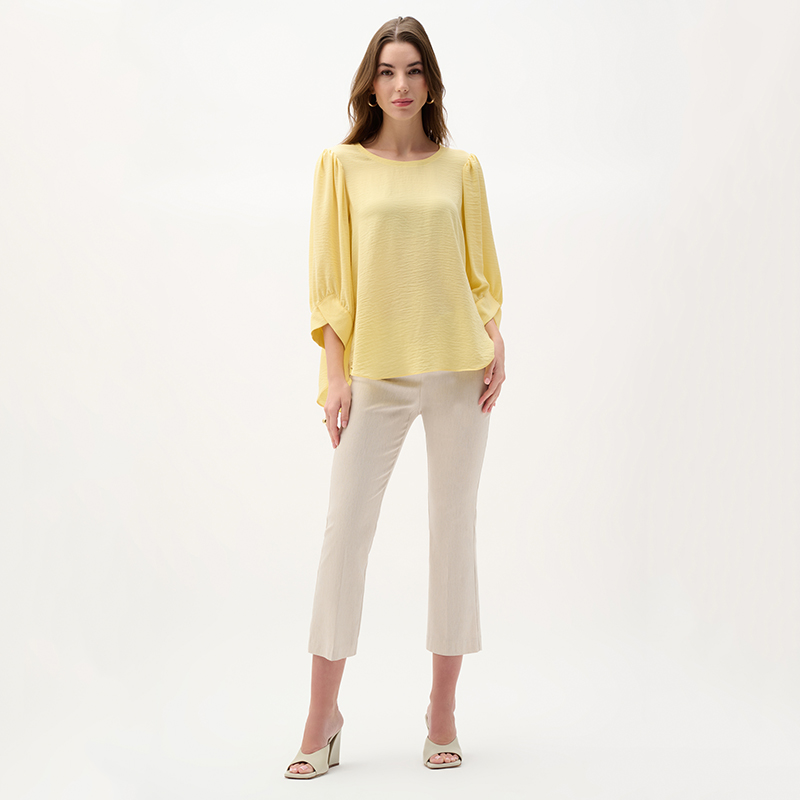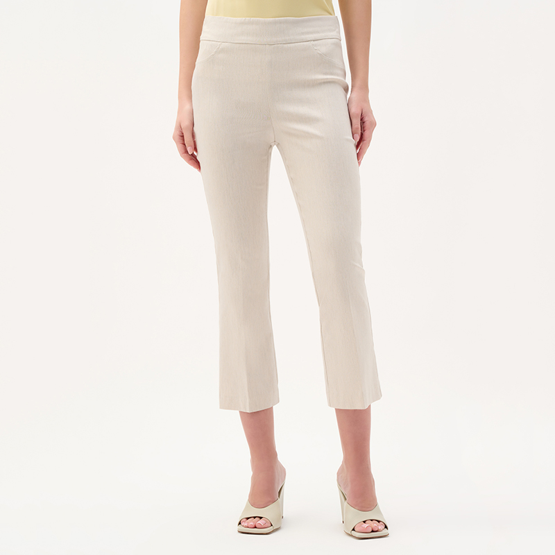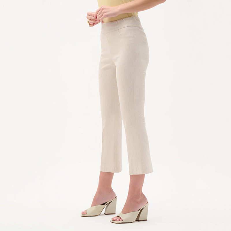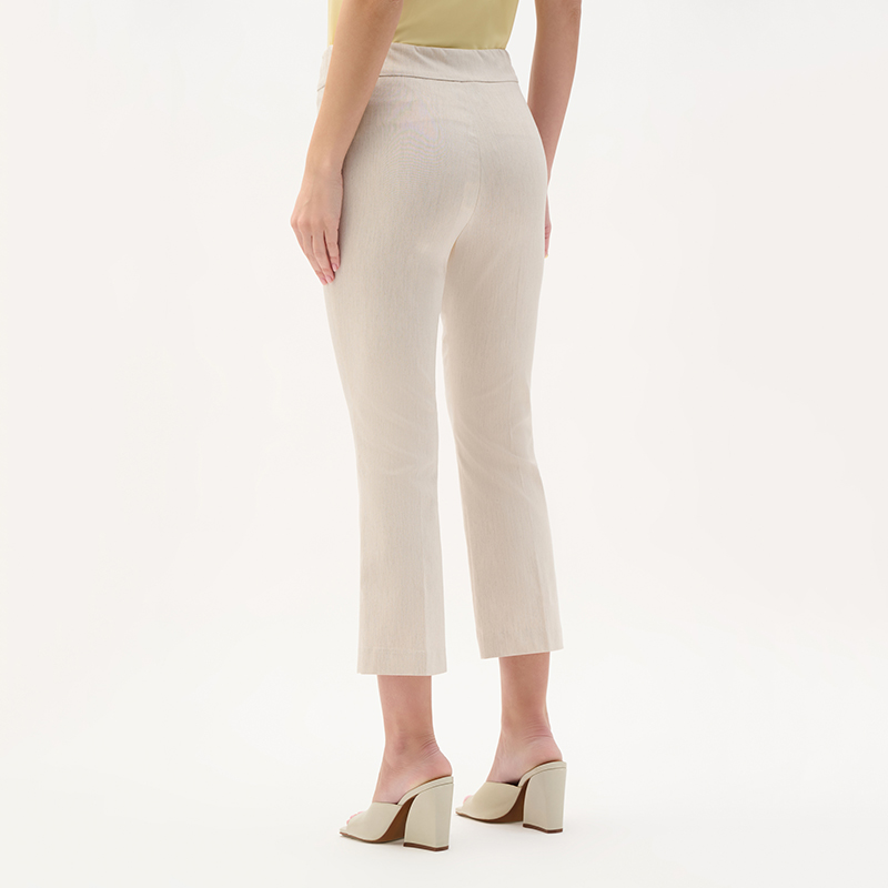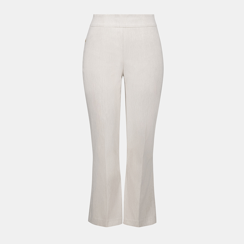Modèle ajusté sur la jambe et légèrement évasé au bas, matière extensible disponible dans une très belle couleur naturel avec une texture nuancé.