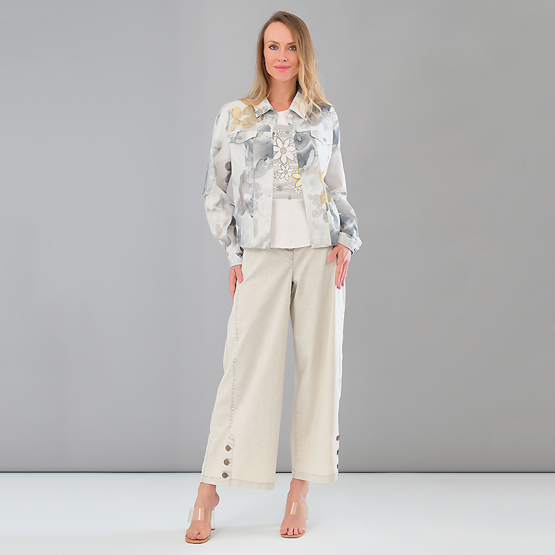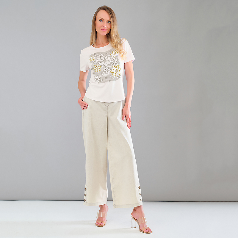 Modèle jambes larges avec trois boutons au bas, tissus léger et extensible, disponible beige.
