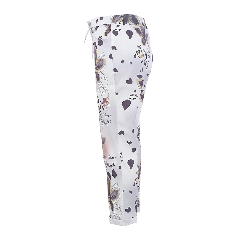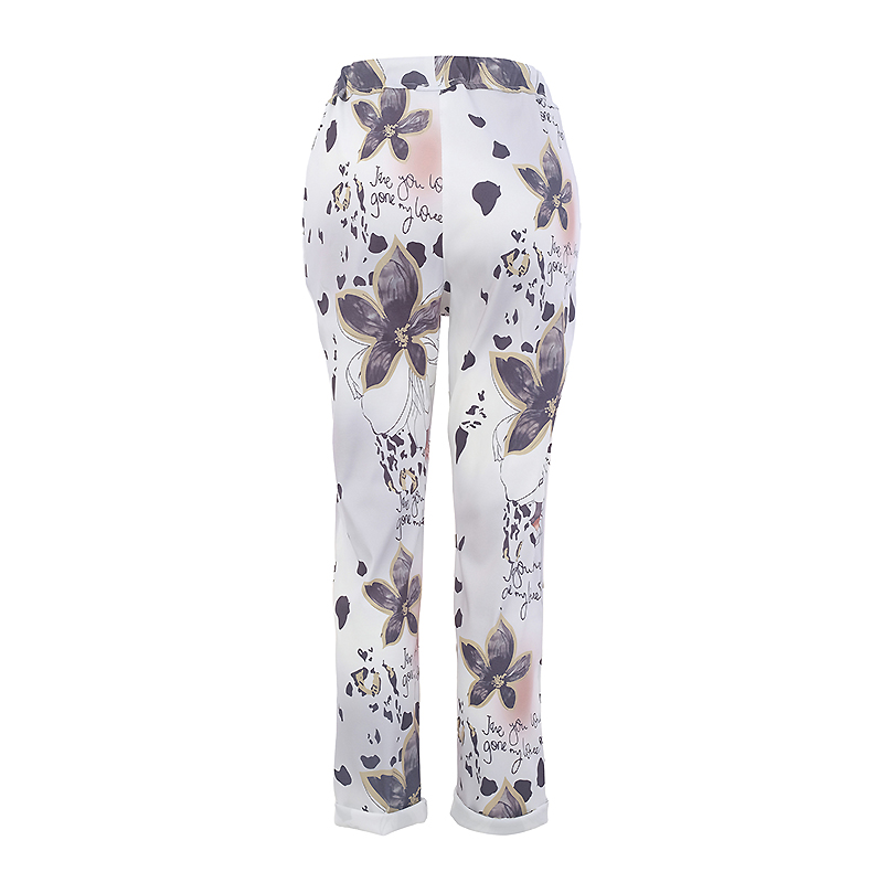 Modèle jambes droites imprimées sur fond blanc, motifs floraux.