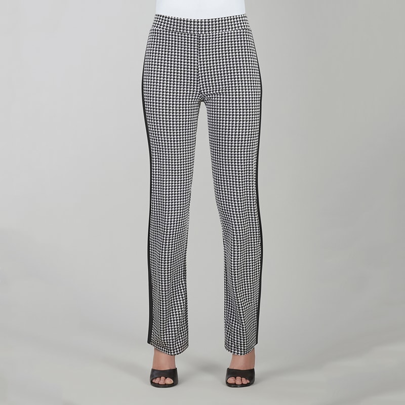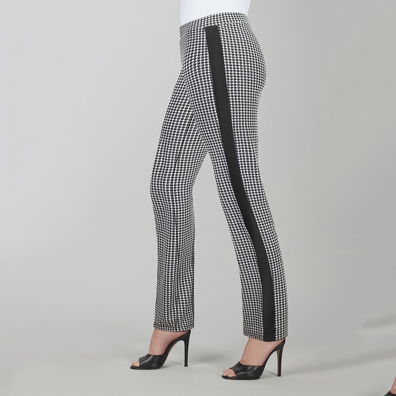 Modèle en petit pieds de coq noir et blanc, bande en similicuir noir sur le côté extérieur des jambes.