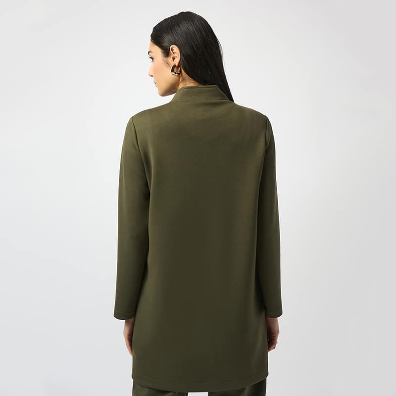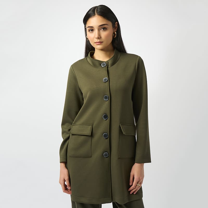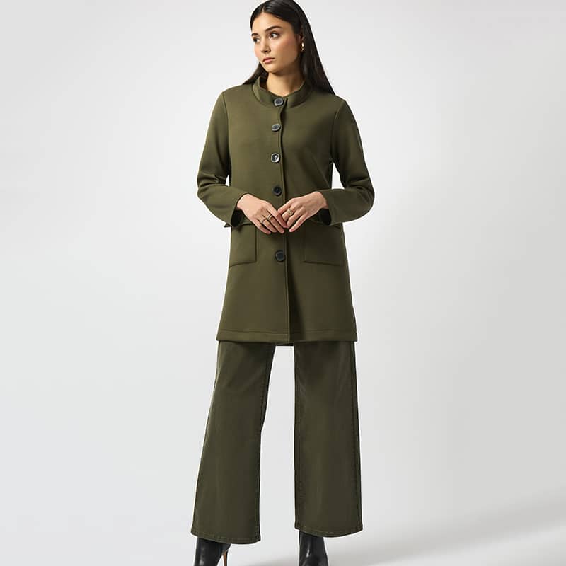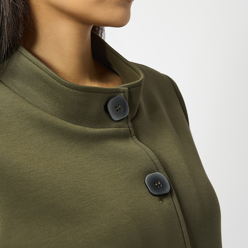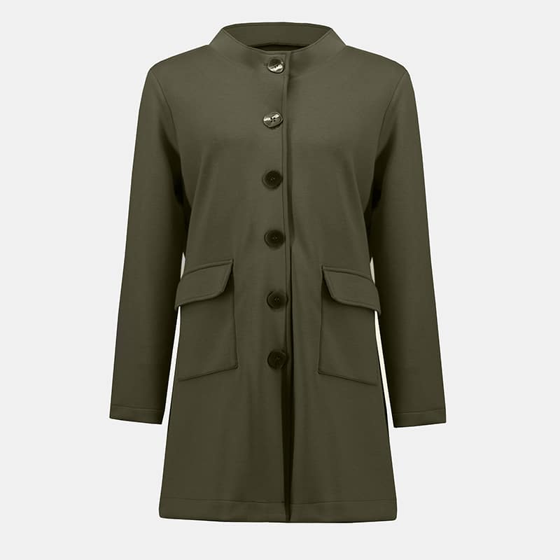 Modèle droit avec coupe relax agrémentée de beaux boutons anthracite, deux poches plaquées aux hanches, non doublé.