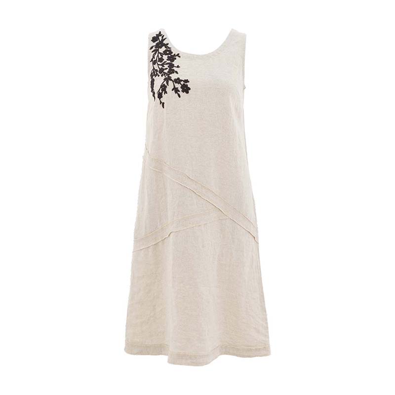 Modèle ample légère évasé, poches dans les coutures de côté, couleur naturel avec une belle broderie noire sur une épaule.