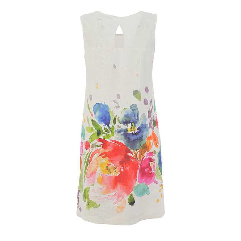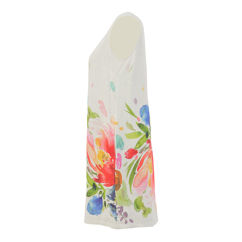 Modèle légèrement évasé, poches dans les coutures de côté, bel imprimé blanc multicolore aux motifs floraux.