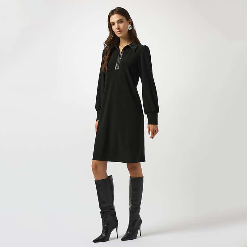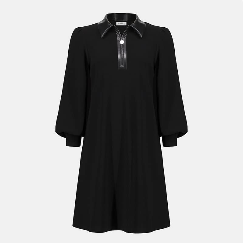 Jolie robe courte à manches longues, col polo en similicuir avec fermeture éclair.
