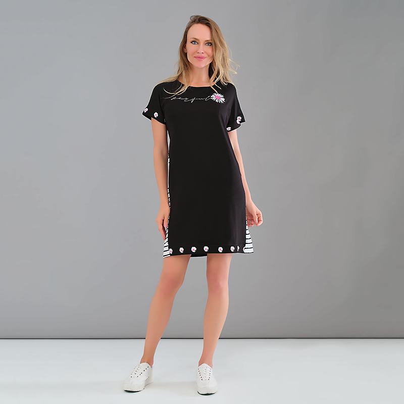 Modèle droit noir et blanc, insertions de rayures de chaque côté, jolis motifs de marguerites au cœur rose.