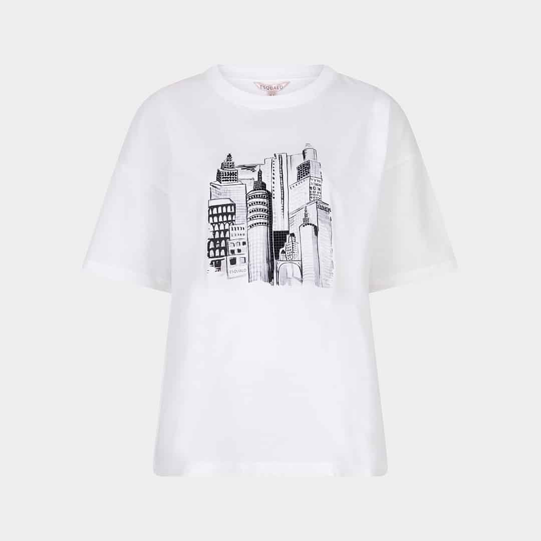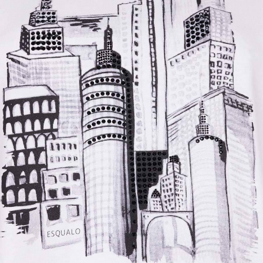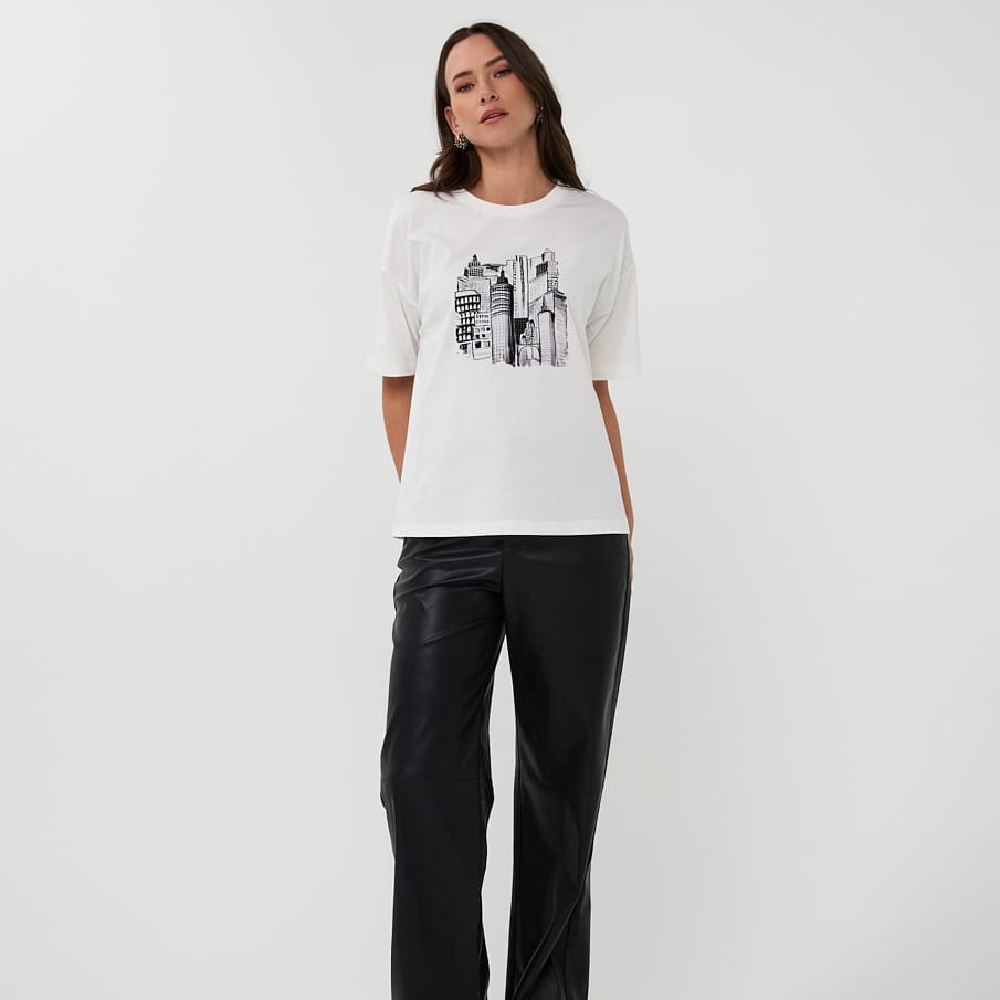 Modèle ample avec des coutures d’épaules basses, disponible ivoire avec des motifs de gratte-ciels noirs et charcoals.