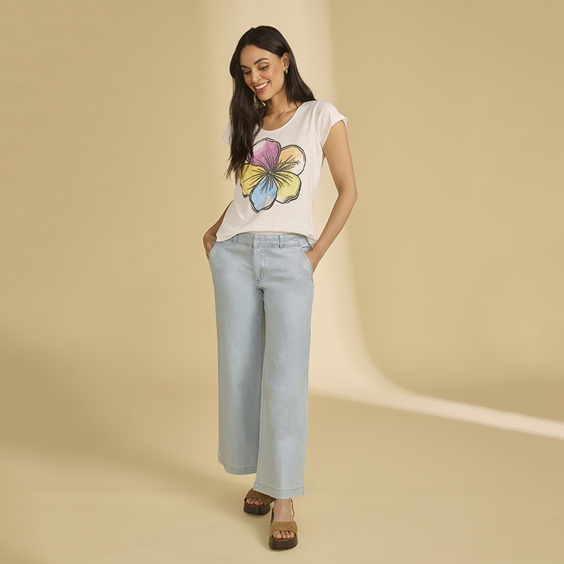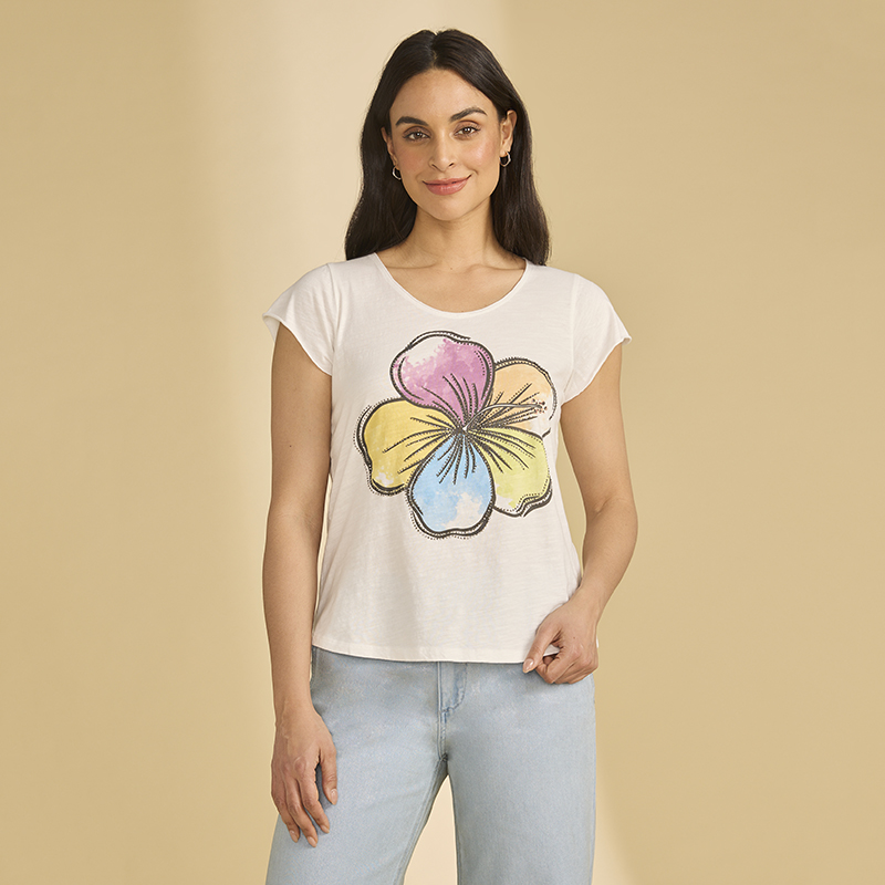 Modèle court et droit, blanc avec une belle fleur multicolore au devant.