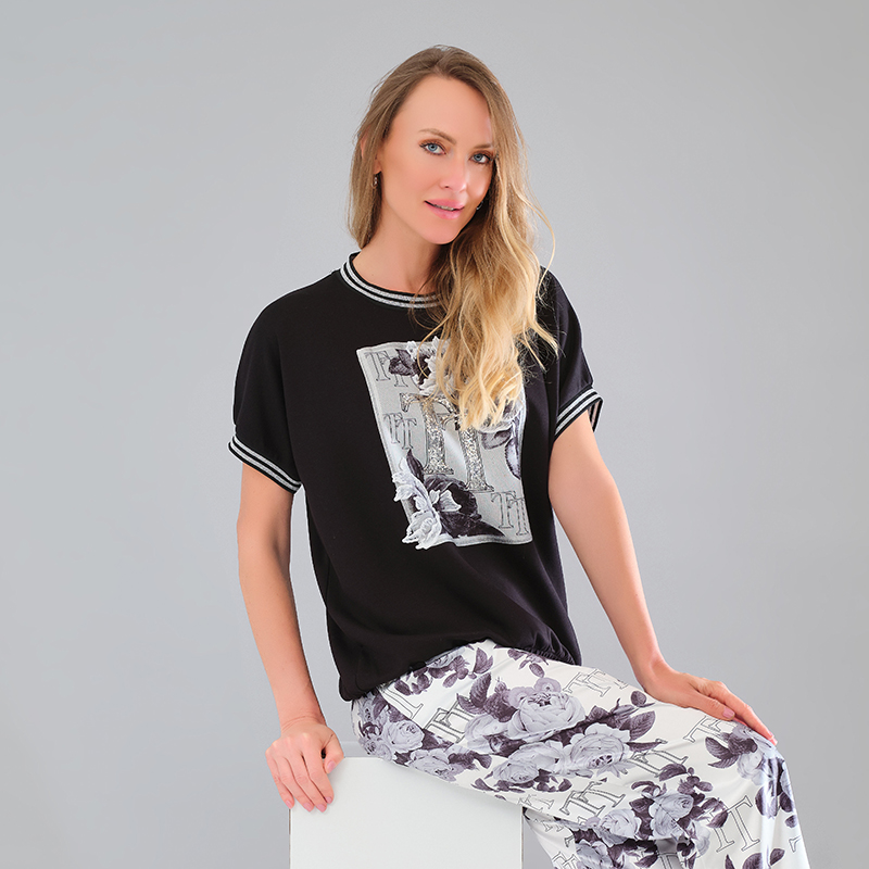 T-shirt en tricot soyeux à manches courtes structurées, encolure ronde bordée argent.