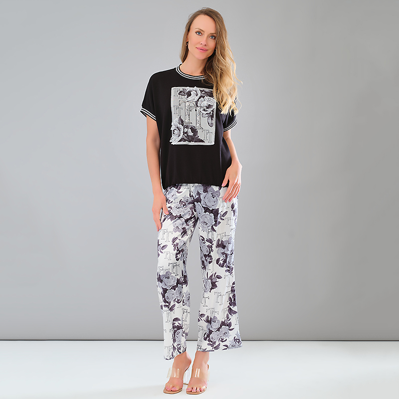 Modèle droit resserré au bas avec un élastique ajustable, noir et argent.