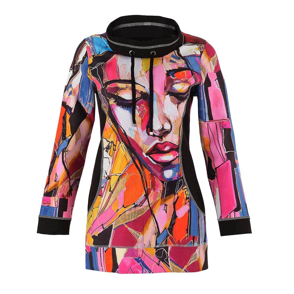 Modèle semi ajusté, magnifique imprimé coloré d’une toile de l’artiste « Lana Frey » bandes noires de chaque côté pour un bel effet amincissant, poches dans les coutures de côté.