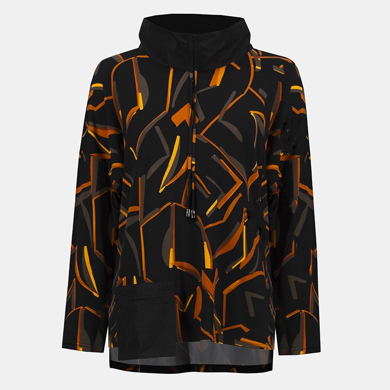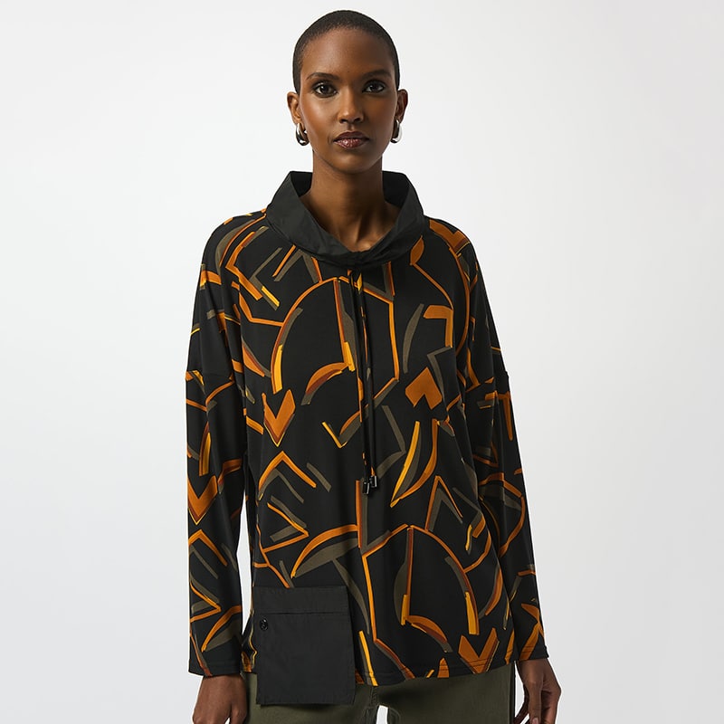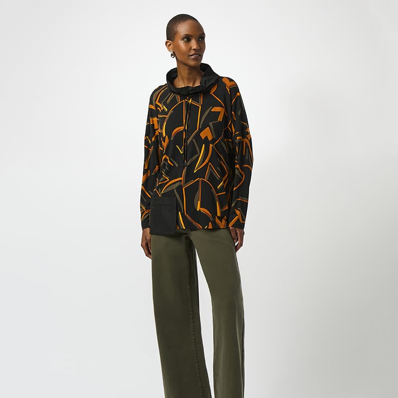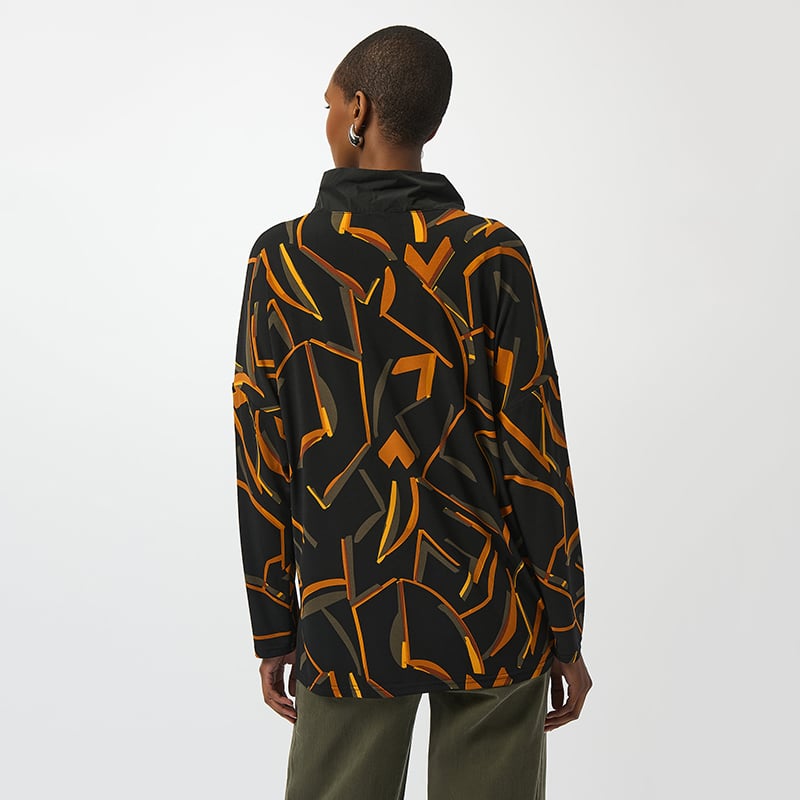 Tunique en jersey léger à manches longues avec coutures basses aux épaules, col montant en taffetas noir.