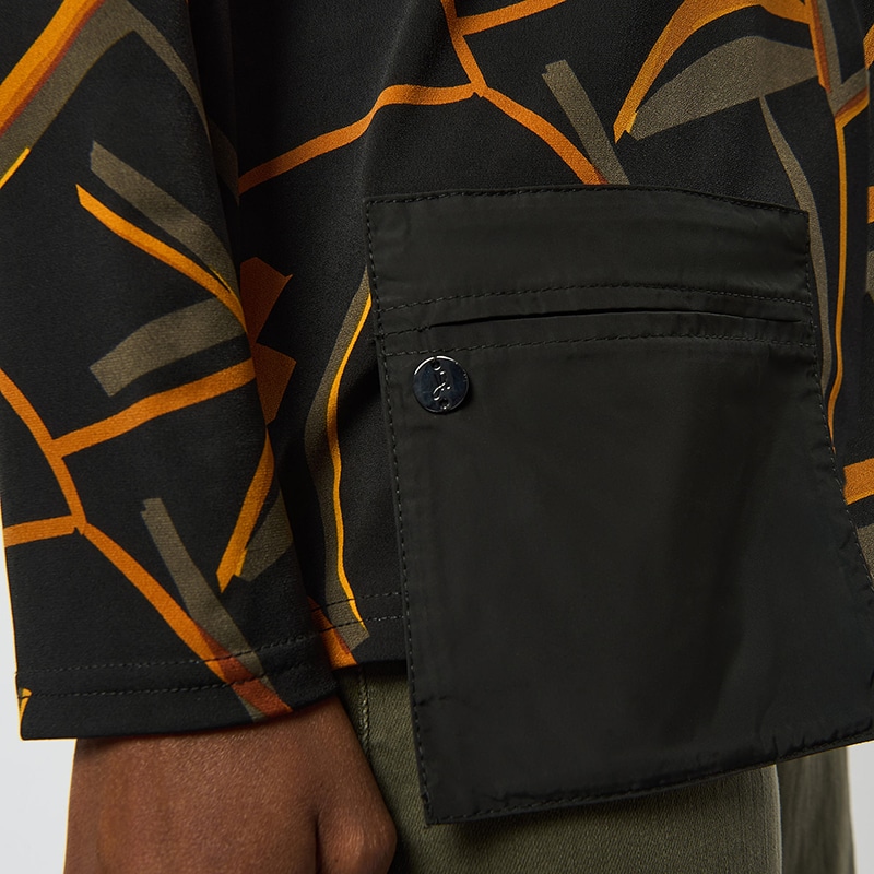 Modèle ample noir multicolore ouvert dans les côtés, rappel de taffetas avec une poche au bas à droite.