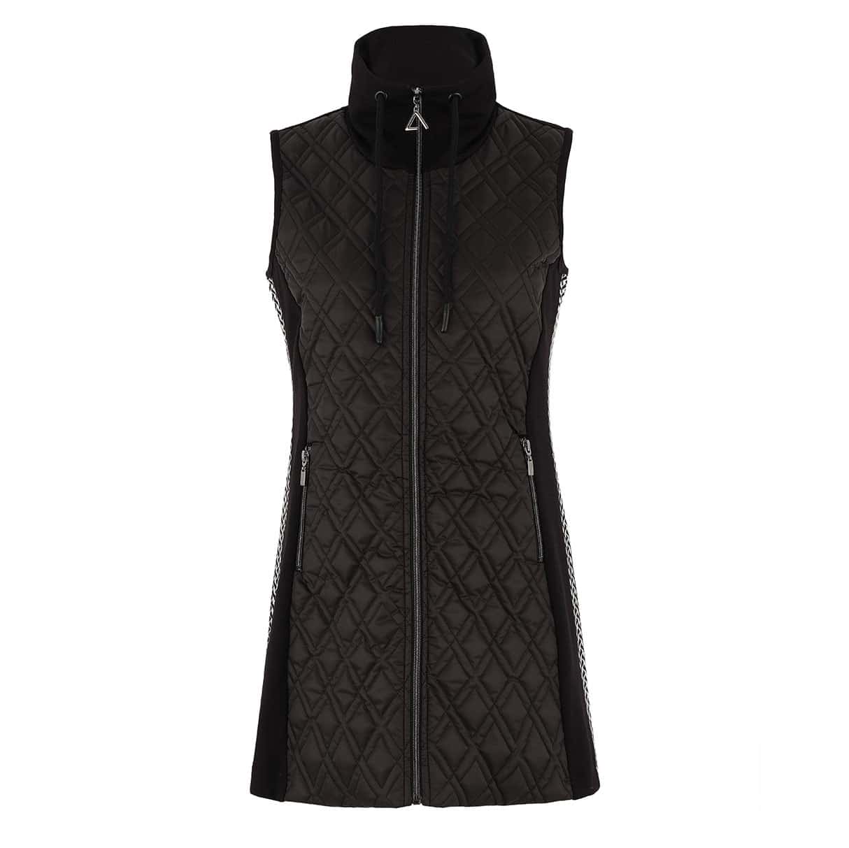 Veste longue sans manches, col montant avec fermeture éclair et cordon.