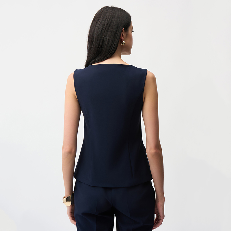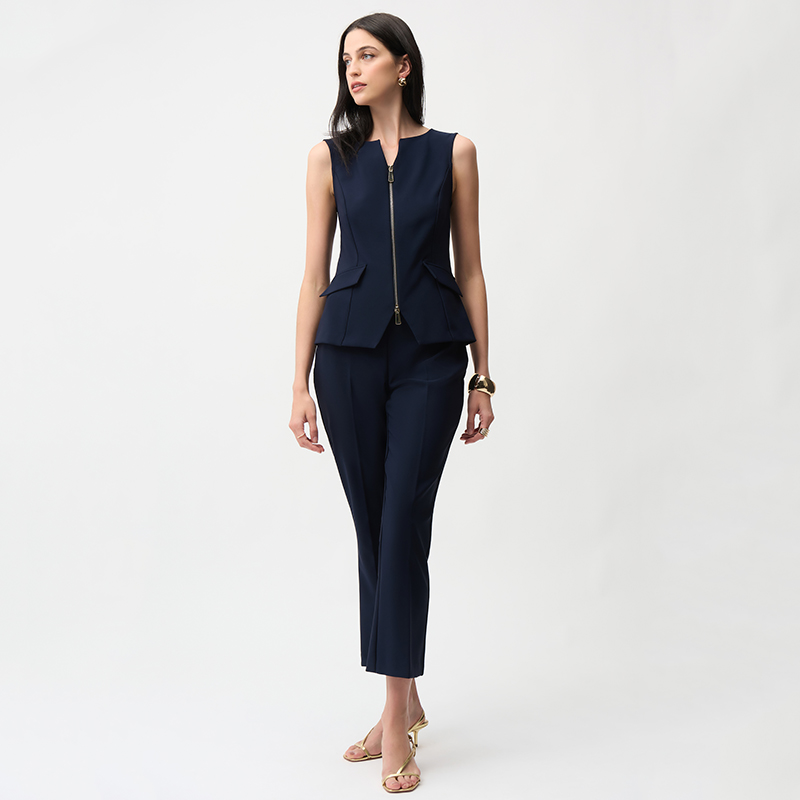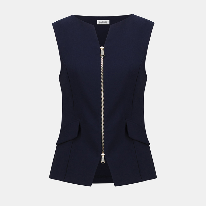 Modèle ajusté avec une fermeture éclair dorée à double sens, fausses poches, disponible marine.