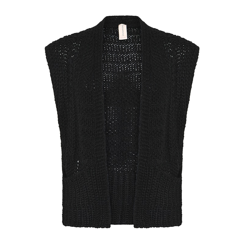 Veste en gros tricot léger, sans manches, sans col et sans attaches.